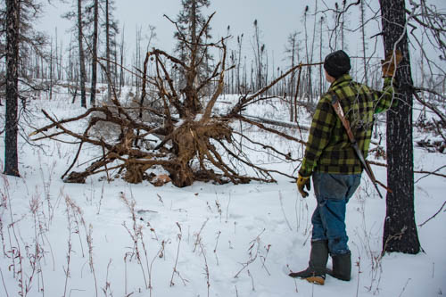 In early winter, with a gray sky and a cold south wind, six inches of new snow on the stumps and snags, “bleak” is completely inadequate. Quick, call Cormac for another new adjective. Blackened trunks of charred trees, tipped and fallen and lying all akimbo in every direction, some hollowed by the flames into weird charcoal gargoyles partway up thick trunks, massive webs of tipped root clusters, hung with clumps of sand and small boulders still snared in their tangle when they were yanked sideways up out of the ground. Not a track on the snow anywhere, not so much as a mouse or a squirrel, and not a bird in sight. And most certainly not a caribou within fifty or a hundred miles of here, today. Not one.